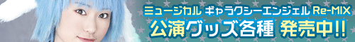 ◆2005年11月2日(水) 「GATVII」やラジオにもミュージカルキャストが登場アニマックスで毎週日曜日深夜25時から好評放送中の「アキハバラ情報局withGATVII」。この「GATVII」部分でミュージカルのキャストのインタビューを放送中! さらに11月3・4週目中にはゲスト出演もしちゃいますよ〜。誰が出るかは直前にお伝えしますねっ。お楽しみに〜!それから「音泉」さんのラジオにもミュージカルキャストが続々お邪魔しちゃいます☆ 今決定しているのは下記! チェックよろしくお願いしますね〜。 ▼11/10配信 クロスワールドレイディオ #19 ミュージカルギャラクシーエンジェルより烏丸ちとせ役:中山恵里奈さん ▼11/11放送⇒11/17配信 水野良 produce りょーことゆーなのG☆A☆ #15 ミュージカルギャラクシーエンジェルより蘭花・フランボワーズ役:小出由華さん、烏丸ちとせ役:中山恵里奈さん ◆2005年11月1日(火) イープラスブログで動画が見られます!どんどん更新されているイープラスオフシャルブログ!なんと、前回公演の映像が少しですが見られます! チェックしてみて下さいね☆ ◆2005年10月30日(日) 秋まつりありがとうございました〜!新宿FACEにて行われた「ブロッコリー秋まつり」。ミュージカルGAからも小出さん、明坂さん、中山さんが参戦! ミュージカルの曲を4曲も披露しました!当日のリアルタイムレポートがイープラスオフシャルブログに掲載中☆ 写真も載っているので、ぜひぜひチェックして下さいね! ◆2005年10月24日(月) 22日、23日発売記念イベントレポート22日、23日とチケット発売記念イベントが行われました!22日はゲーマーズ本店と池袋店。23日は池袋サンシャインで行われた「コミックキャッスル」内で。たくさんのお客さんと触れ合えて、キャストもいっぱい元気を貰いました。本当にありがとうございました! こちらのイベントのリアルタイムレポートがイープラスの公式ブログで見られます! 写真もいっぱいだから、皆さん、チェックして下さいね! 次にキャストと会えるのは30日の「ブロッコリー秋まつり」です。ここではミュージカルで歌われた歌も何曲か披露しちゃいますよ! ぜひ来て下さいね。 ◆2005年10月18日(火) 「ミュージカルギャラクシーエンジェルRe-MIX」の先行販売申し込みをしてくださった沢山のファンの皆様へ、御礼とお詫びチケットの先行販売お申し込みいただきまして、まことにありがとうございました。 大変ありがたいことに「スーパーロイヤル席」は全日程、全席お申し込み多数で抽選となりました。 ただいま、お申し込みいただきましたデータを整理しております。 数日で抽選を行いまして、結果をメールにてご連絡申し上げます。「スーパーロイヤル席」は幾つかの公演で、席数をはるかに上回るお申し込みとなりました。 又、「エンジェル隊応援席」も会期後半の公演は、全てお申し込み多数で抽選となりました。 前半の公演も少数の席が残るのみといった状態です。 これだけ今回のRe-MIXに期待を寄せて下さっていることは、私どもにとっては大変うれしいことでございますが、反面お申し込みいただいた多数のお客様のご期待に応えて席を用意できないことは本当に残念です。 この場を借りて改めてお詫びいたします。 キャスト、制作関係者全てにこの先行お申し込みの結果を連絡いたしました。 各人とも喜びつつ皆様のご期待に応えるべく、改めて良い舞台を作ることを決意した返答がこちらに戻ってきております。 特にエンジェル隊のキャストの面々には、初回である前回と異なり本人たちの気持ちの中に不安がなく、良い舞台を作ろうという前向きな気持ちしかありませんから、今回のお申し込みの結果は更なるヤル気を出す励みとなりました。 僭越ではございますが、22日からゲーマーズ店頭、通信販売(Web店)及びイープラスにて開始いたします一般販売で、ロイヤル席以下お早めにお買い求めいただきますようお願いいたします。 イープラスで、「ミュージカル『ギャラクシーエンジェル』」のオフィシャルブログが始まりました。スタッフによる制作日記が公開中です。こちらのダイアリーと内容がかぶることもありますが、色んな人の視点で、小さな出来事から大きな出来事まで綴っていきますので、イープラスの方もぜひぜひチェックしてみて下さいね! 宜しくお願いいたします〜。 ◆2005年10月21日(金) 先行販売申し込みにおける抽選結果のご連絡と一般発売について2005年10月14日(金)〜10月17日(月)に実施致しました先行販売チケットの抽選実施の有無、抽選結果につきましては、お申し込み頂きましたお客様にメールにて個別にご連絡しております。尚、チケットの一般販売は下記の通りでございます。