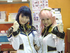 >>詳しい情報はこちらで確認! ◆2005年7月2日(土) ミュージカルギャラクシーエンジェルDVD発売記念イベントレポート7月2日に行われた秋葉原アソビットシティとゲーマーズ本店で「DVD発売記念イベント」が行われました!この日登場したのはミルフィーユ役の富田さん、フォルテ役の白川さん、ちとせ役の中山さんの3人。「3人だけどエンジェル隊で〜す♪」というセリフで会場を沸かせました。 まずアソビットシティのイベントスペースでは「ギャラクシーエンジェル」「エンジェル隊からあなたへ」「いつも一緒にネ!」の3曲が歌われ、グッズのじゃんけん抽選会や舞台裏話など大爆笑のトークが繰り広げられました。 この後、ゲーマーズに移動したキャスト達ですが、店頭にはもう溢れんばかりの人人人! ここでは「Eternal Love」と「いつも一緒にネ!」の2曲を熱唱。BOXからお客さんに質問用紙を取り出してもらって、それに答える形式でトーク。こちらも裏話いっぱいで盛り上がりました。そしてDVD先着購入者100名様への握手会、ファンの方一人一人とお話が出来て、キャストの3人も大満足だったとのこと。皆さんはどうでしたか? 次に会えるのは東京キャラクターショーですが、サイン会だけでなく、サイン入りグッズや新写真を販売しちゃう予定です。さらにステージではミュージカルの今後の展開も発表されますよ〜。ぜひぜひ、キャラショーにもお越しくださいね☆ ◆2005年6月21日(火) ◆DVD発売間近!ゲーマーズ先着購入特典はこれだ!いよいよ発売されるDVD「ミュージカル『ギャラクシーエンジェル』」。なんとなんと、ゲーマーズ先着購入特典としてキャストの写真がついてくるという情報をGET!特別にお見せしちゃいます☆