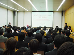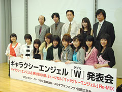 ギャラクシーエンジェルIIやミュージカル『ギャラクシーエンジェル』、クロスワールドなどのキャストが登場し、さまざまなコンテンツの合同となる本イベントでは、歌ありトークありゲームあり(?)の盛りだくさん!もちろんミュージカルのエンジェル隊もまつりに駆けつけてくれるゾ! >> 出演者や詳しい内容はココで確認しよう!! ◆2005年10月6日(木) A席、B席も先行予約あります!A席、B席、ロイヤル席を「イープラス」でも先行予約(プレオーダー)をいたします! 予約開始はゲーマーズ通信販売と同じ10/14(金)18:00ですが、終了時間はちょっと早めの10/16(日)18:00なのでご注意ください。スーパーロイヤルはちょっとためらっているけどA席・B席なら見てみたい……というアナタ! お席を確実に確保するにはプレオーダーは最適ですよ〜。もちろん、ゲーマーズ通信販売では貴重なスーパーロイヤル席、エンジェル隊応援席、そしてロイヤル席を扱いますので、かぶりつきで見たいアナタはぜひゲーマーズ通信販売でご予約ください!! ◆2005年10月4日(火) ギャラクシーエンジェル「W(ダブル)」発表会開催GAプロジェクトのスタートから5年。節目となる今年、ギャラクシーエンジェルワールドを更に広げる二つの作品が発進する。 10月4日(火)読売広告社9階コムホールにて2006年2月23日発売予定プレイステーション2専用ソフト「ギャラクシーエンジェルII絶対領域の扉」と2005年12月7日から公演される「ミュージカルギャラクシーエンジェルRe-MIX」の「W(ダブル)」発表会が開催された。 この発表会の為に雑誌や新聞、インターネットニュースサイトをはじめ、各業界関係者や、 発表会をレポートするHP、ブログを管理する一般から公募した「ユーザー記者」を含め150人以上の人たちが集まった。 「出陣式」と位置付けられたこの発表会では、まず2006年2月23日発売予定プレイステーション2専用ソフト「ギャラクシーエンジェルII絶対領域の扉」と2005年12月7日から公演される「ミュージカルギャラクシーエンジェルRe-MIX」のPV上映や、ブロッコリー代表取締役会長兼開発最高責任者である木谷会長からの製作コンセプトを説明。 プロデューサー水野良さん。チーフディレクター土田康司さん。シナリオコーディネーター菜の花すみれさんによるギャラクシーエンジェルIIの世界観、ゲームの見どころを説明。 続いてミュージカルギャラクシーエンジェルRe-MIXのエグゼクティブプロデュサーの片岡義朗さんから説明などがあり、GAII声優陣(アプリコット・桜葉役 稲村優奈さん、アニス・アジート役花村怜美さん カルーア・マジョラム役 平野綾さん、ナノナノ・プディング役 明坂聡美さん リリィ・C・シャーベット役 中山恵里奈さん ミルフィーユ・桜葉役 新谷良子さん)、GAミュージカルRe-MIXのキャスト陣(ミルフィーユ・桜葉役 富田麻帆さん 蘭花・フランボワーズ役 小出由華さん、ミント・ブラマンシュ役 小野まりえさん ヴァニラ・アッシュ役 明坂聡美さん 烏丸ちとせ役 中山恵里奈さん)がそれぞれの役について説明や意気込みを語った。 ※(フォルテ・シュトーレン役 白川りささんは諸事情で欠席) そして、前回のミュージカルGAを直に見て出演を決めたブルゴーニュ役 横山智佐さんが登場。意気込みを語った。 横山さんは次のお仕事のためその後退席されたが、豪華な製作陣キャスト陣が一同に会して観客席のボルテージが一気に上がったところで注目すべきGAIIのOP・ED曲を木谷会長の口から発表された。 まずエンディングを前回GAEternal LoversでOP『Angelic Symphony』でお馴染みの佐藤裕美さんが歌うことを発表。 そして気になるOPはなんと「萌え」と「燃え」の2ヴァージョン用意されており、「萌え」の方の主題歌をその会場にいる富田麻帆さんが歌うことを発表された。 もうひとつの方が気になり会場がざわめいているところに会場の電気が消えスクリーンがぱっと明るくなった。 そこに映し出されたのはなんと影山ヒロノブさん! その口からさらに衝撃の「Eternal Love」を歌うことが発表され、スクリーンの中で影山さんが「GAが未来に羽ばたけるように最高の歌を歌いたいと思います!」と抱負を熱く語った。 影山さん用に「Eternal Love」はアレンジされるようだが「燃え」バージョンの主題歌に会場全体が期待を膨らませた。 熱気冷めやらぬ中、ミュージカルGAも負けじとその場にいたミュージカルキャスト全員が舞台へあがり、「Eternal Love」を披露。大いに盛り上がりを見せた。 最後に木谷会長の挨拶で 「ギャラクシーエンジェルII 絶対領域の扉」と「ミュージカルギャラクシーエンジェル Re-MIX」の「ギャラクシーエンジェル『W』発表会」は締めくくられたが。 「ギャラクシーエンジェルII」「ミュージカルギャラクシーエンジェル Re-MIX」ともに前作を超える確かな期待感を強く感じさせる発表会となった。