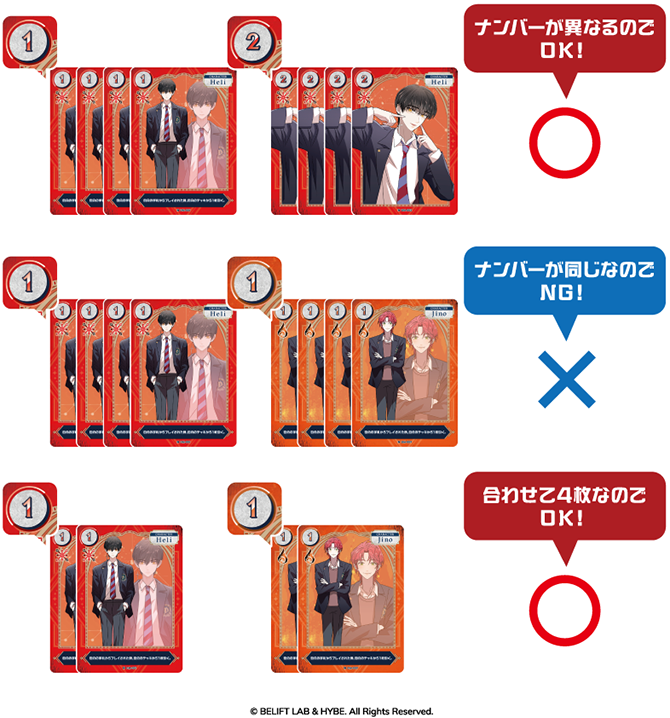 - カード左上のナンバーが同じキャラクターカードは、合わせて4枚までしか入れることができません。